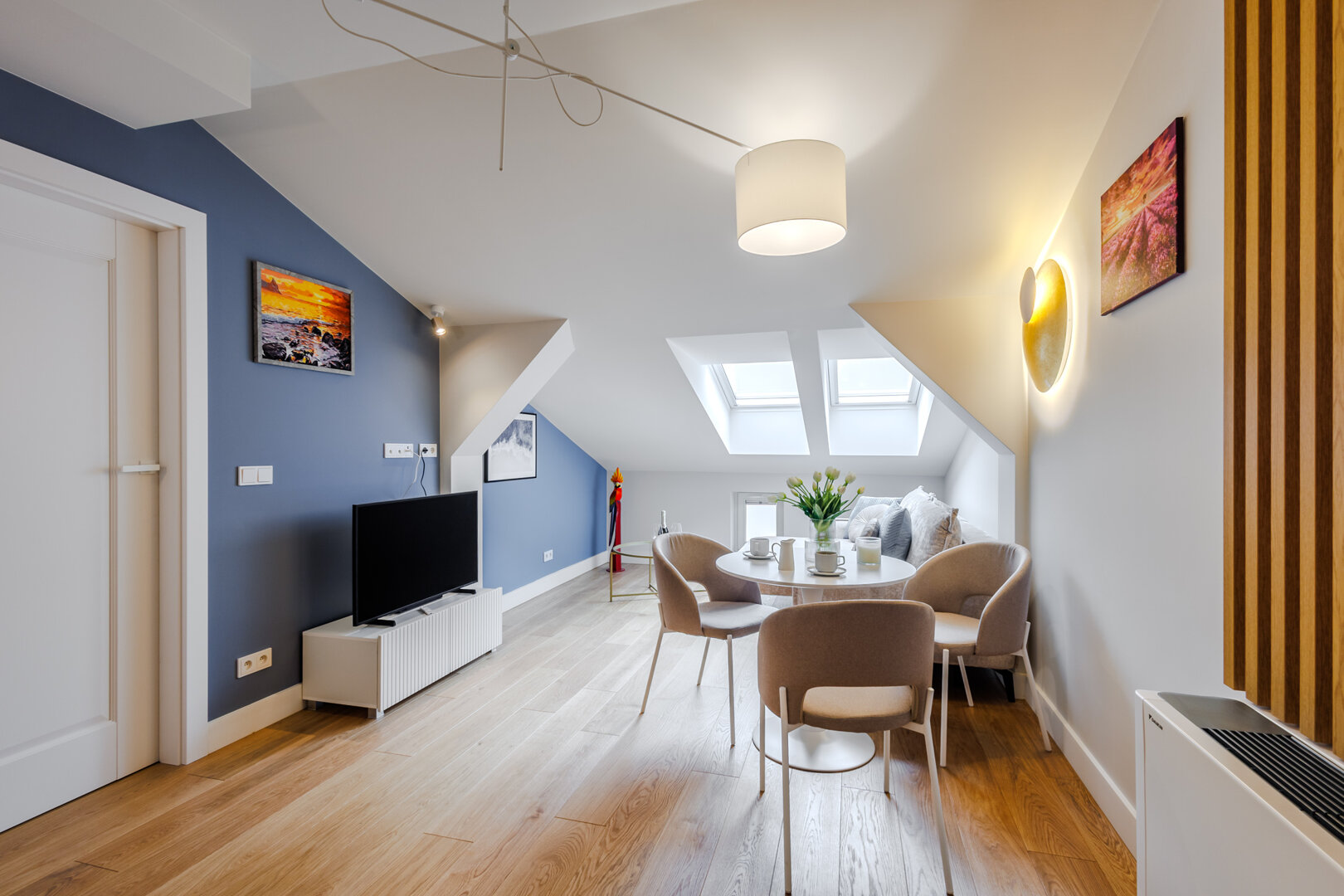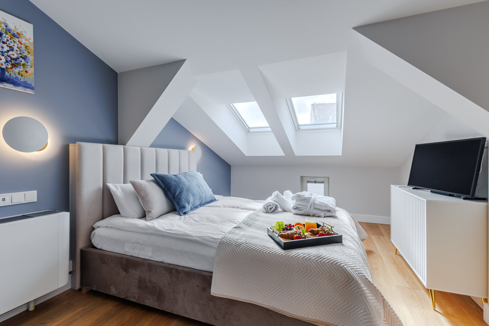 Stylowy apartament z przytulną sypialnią oraz eleganckim salonem z sofą i aneksem kuchennym, zaprojektowany z dbałością o detale i komfort. Jasne wnętrze tworzy wyjątkową atmosferę do wypoczynku, a balkon stanowi idealne miejsce na chwile relaksu.