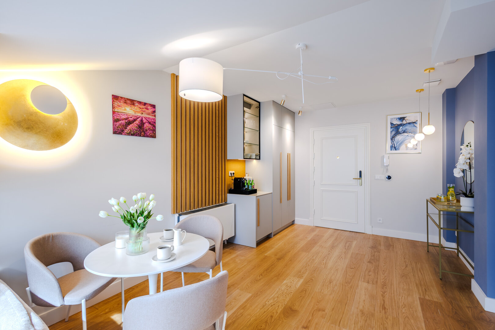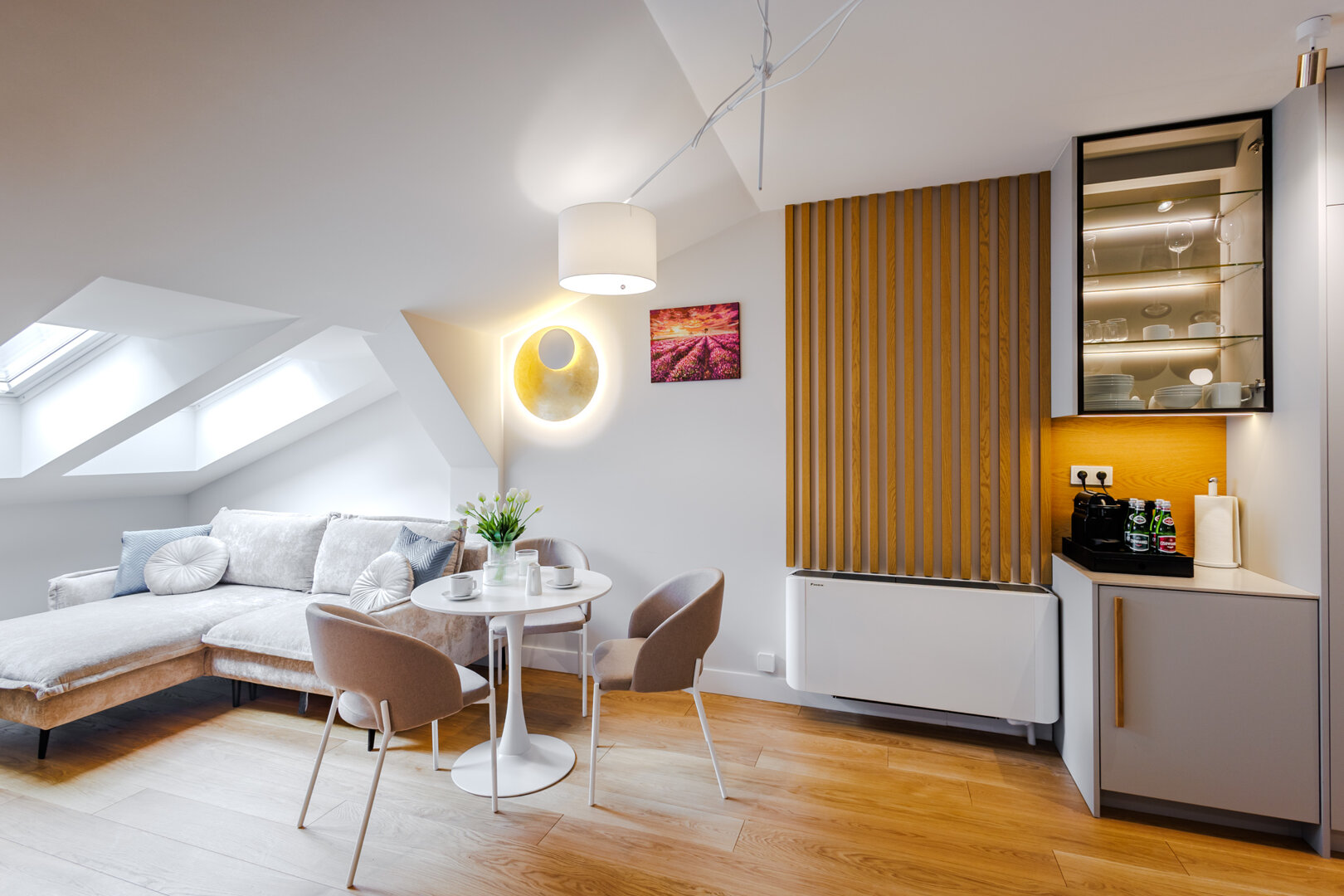 Niewielki, lecz urokliwy apartament łączący nowoczesność z klasyczną elegancją. Do dyspozycji gości jest również łazienka z prysznicem, zaprojektowana z myślą o wygodzie i codziennym komforcie oraz lodówka i zestaw do parzenia kawy i herbaty z ekspresem.