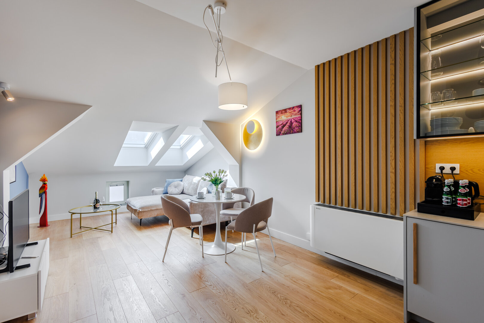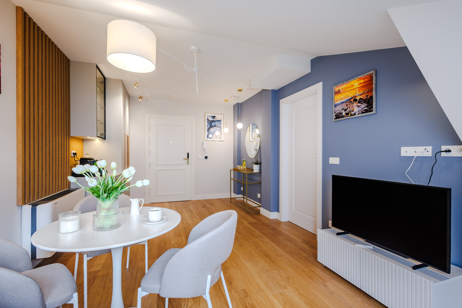Nowoczesny, a zarazem przytulny apartament – idealny zarówno na krótki wypad, jak i dłuższy pobyt. Wnętrze łączy elegancję z funkcjonalnością, oferując komfortową sypialnię oraz przestronny salon z rozkładaną sofą i w pełni wyposażonym aneksem kuchennym.