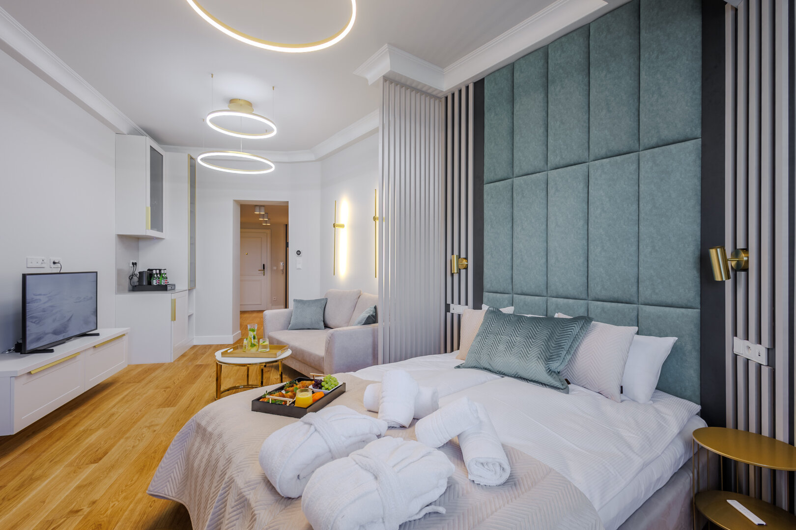 Stylowy apartament z przytulną sypialnią oraz eleganckim salonem z sofą i aneksem kuchennym, zaprojektowany z dbałością o detale i komfort. Jasne wnętrze tworzy wyjątkową atmosferę do wypoczynku, a balkon stanowi idealne miejsce na chwile relaksu.