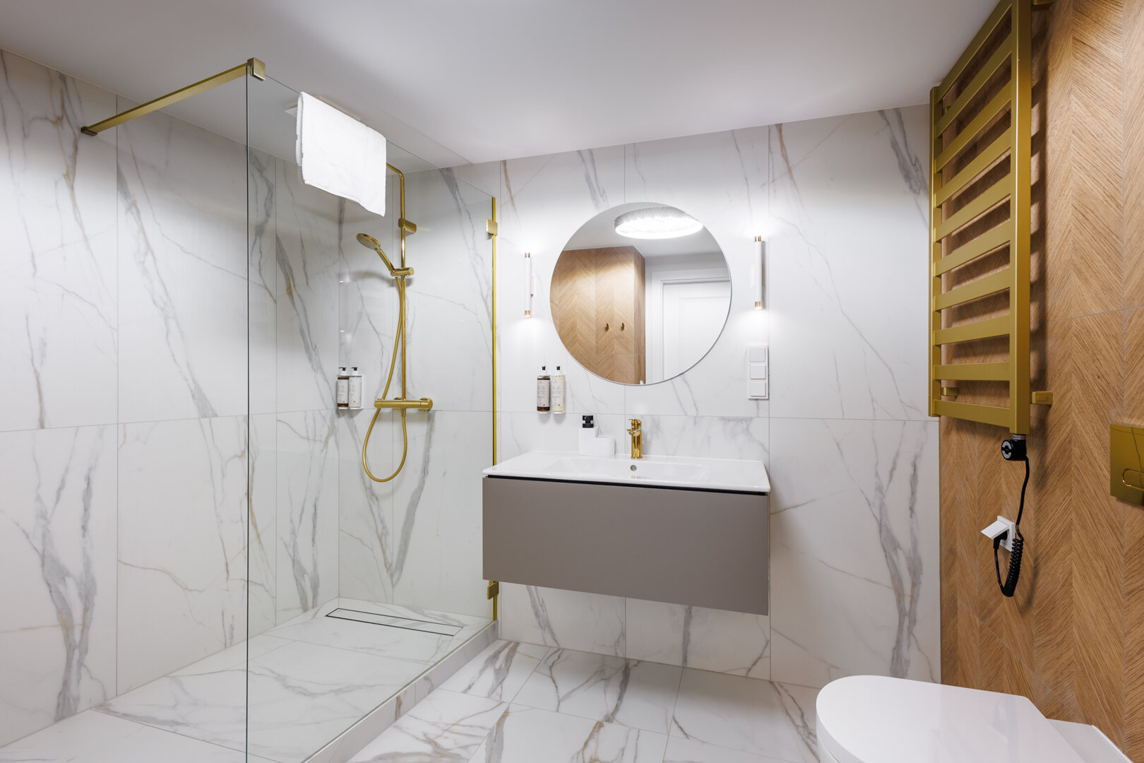 Przestronny, elegancki apartament łączący nowoczesny design z subtelnym klasycznym charakterem. Wnętrze obejmuje funkcjonalny aneks kuchenny, który pozwala na wygodne przygotowywanie posiłków. Do dyspozycji gości jest również łazienka z dużym prysznicem.
